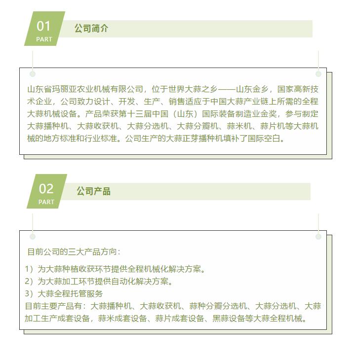 6月2日上午,第十一批玛丽亚村村通村企共建合作站点推介会成功举办。 金乡县司马镇副镇长李玉方带领镇部分村干部参加了此次推介会。董事长辛丽等陪同领导一行参观工厂。在参观完大蒜机播示范基地,现场观摩玛丽亚大蒜播种机的作业演示后,大家在公司研发中心报告厅进行了座谈及签约。李镇长在座谈会上肯定了玛丽亚在推进农业机械化方面做出的成绩,也希望到场的村干部们回去多思考,利用玛丽亚提供的平台更好的发展村集体经济。