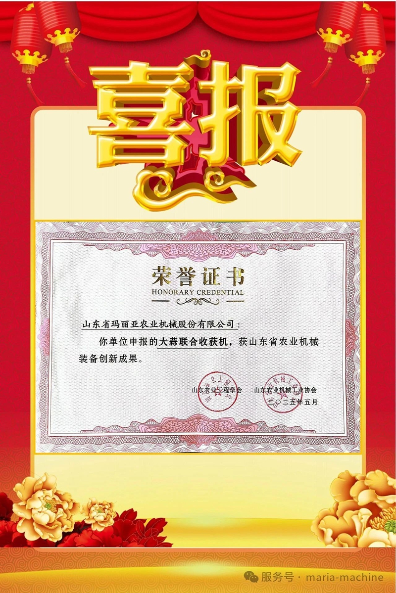 喜报丨玛丽亚大蒜联合收获机荣获“山东省农业机械装备创新成果”