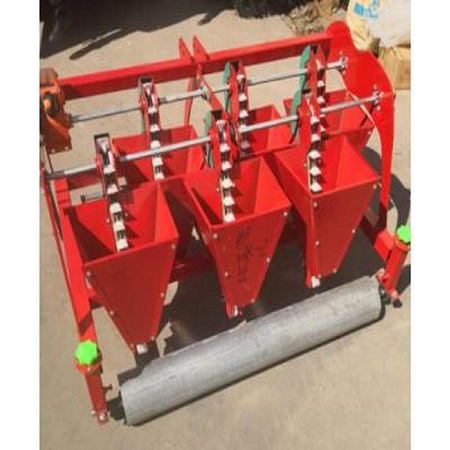 大蒜播种机,由种籽箱、无线电发射器、平沟器、进行开沟器、锥型轮、传动传动链条、传动齿轮、接地装置轮、支撑架和牵引带架构成。大蒜播种机牵引带架后面设定支撑架,支撑架上边设定种籽箱,支撑架下面设定接地装置轮,接地装置轮同轴设定传动齿轮。种籽箱下面内部设定无线电发射器,无线电发射器下面设定有进行开沟器,种籽箱一侧壳体上设定有锥型轮,锥型轮的轴榫越过壳体和无线电发射器相连,锥型轮通过传动传动链条和传动齿轮相连。大蒜播种机进行开沟器正后方设定有平沟器,平沟器用来对播入的蒜头种蒜头开展。应用时,蒜头种放置在种籽箱里,由动力系统推动大蒜播种机行走,接地装置轮推动传动齿轮旋转,在传动传动链条的作用下锥型轮与传动齿轮同步旋转,锥型轮则推动无线电发射器输送蒜头种,对蒜头种实施种植。大蒜播种机新型专利结构简单,方便使用,可提高劳动效率和种植质量。